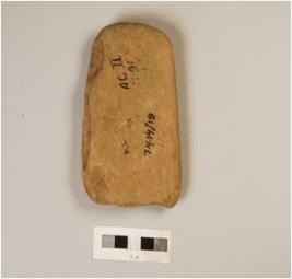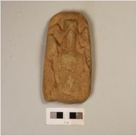 | Description / विवरण | Fragment of stone plaque, depicting diety in standing posture, half broken, wearing headdress, engraved design with incised lines on surface, slightly chipped off from surface and edges, grey in colour. |