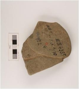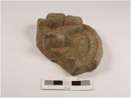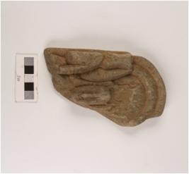| Description / विवरण | Fragmet of a stone plaque depicting a human head with facial features similar to garud decorative back ground, facial feature design through incised lines elliptical eyes and broad nostril with smilling face, long ears background decoated with incised lines. |