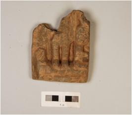 | Description / विवरण | Fragment of stone plaque depicting diety s legs who wear in standing posture on pedestal, upper portion is broken, chipped off from surface, engraved design of tample is visible on edges, slightly incised decoration is also visible, grey in colour. |