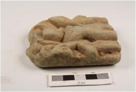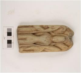 | Description / विवरण | Fragment of a stone plaque representing a female deity, facial features are absent details are done in low relief. |