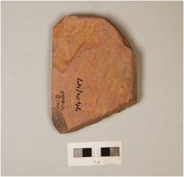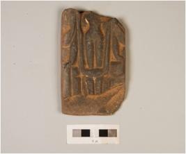 | Description / विवरण | Fragment of stone plaque, depicting diety on surface, head is visible, chipped off from surface, broken edges, incised and engraved design on surface, grey in colour. |