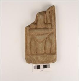 | Description / विवरण | Fragment of a stone plaque shows sitting deity with a out strectched legs, below the deity a design engraved. |