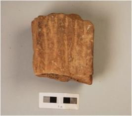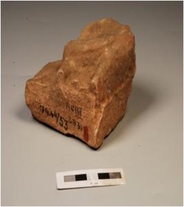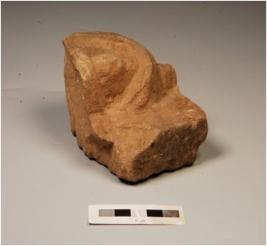 | Description / विवरण | Fragment of stone plaque depicting diety s legs, feet are broken, drappery is visible around knees and between two legs, rough surface, buff in colour. |