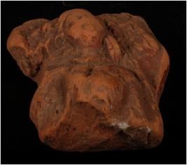 | Description / विवरण | Terracotta female bust with elaborately decorated headdress double pearl fringe on forehead, necklace and earings are intact and well baked |