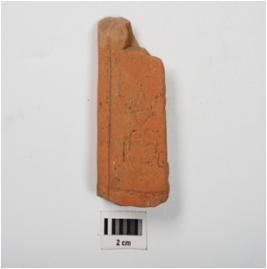 | Description / विवरण | Fragment of handmade terracotta plaque, sri brikasho motif depicting by incised line, broken at both ends, mica visible on surface, wash treatment given in red colour. |