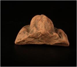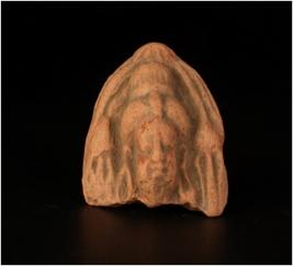 | Description / विवरण | Terracotta head of a human figurine showing hair adorned with a crest and surmounted by a cylindrical top knot of matted locks. Wearing ear rings, pinched nose and treated with a red slip. |