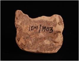 | Description / विवरण | Fragment of mould made clay plaque, legs and right arm are visible, decorated surface and pedestal. |