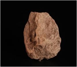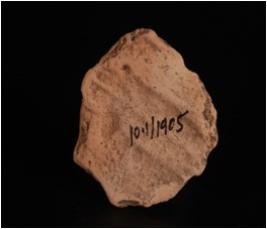 | Description / विवरण | Fragment of mould made clay plaque, figure of diety dipicting on obverse side in seated posture, features are not clear, drappery, arm are visible. Right hand on chest, surface is decorated. |