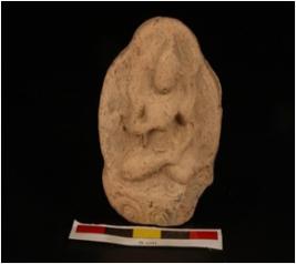 | Description / विवरण | Moulded terracotta plaque with figure in seated in padmasana posture. Probably a diety. Cruded slightly chipped off from surface. |