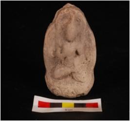 | Description / विवरण | Mould made plaque, depicting sitting buddha on padmasana posture, on a lotus throne, head tilted towards left, right hand kept on chest, mudra not visible, only left arm is visible, traces of creeper surronding the body. |