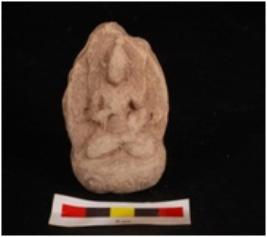 | Description / विवरण | Mould made plaque, depicting, seating budda on padmasana posture, on a lotus throne, designed by incised line, head tilted towards left, social feature & jata not clear, right hand kept on chest, mudra not clear, left hand on thigh, holding lotus, traces of creeper surrounding the body. |