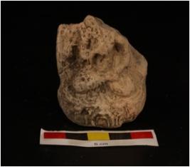 | Description / विवरण | Fragment of moulded terracotta plaque with figure in seated in posture. Hlaf portion is missing. Right hand on breast. Left hand reasted on thigh. |