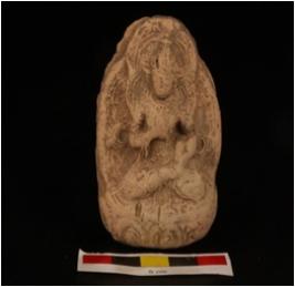 | Description / विवरण | Moulded terracotta plaque, oval shaped, heaving seated figurine on obverse side, probably a diety. Surface is decorated with spiral and loop embose design. |