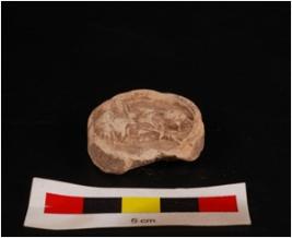 | Description / विवरण | Mould made, sun dried clay plaque with seated human figure, right hand in abhay Mudra and seated on lotus petals, drapery on left shoulder, circular in shape and wash treatment is given, edges are broken. |