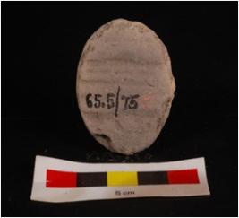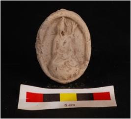 | Description / विवरण | Mould made, sun baked clay plaque with seated diety, seated in lotus petals pedastals, draprey on left shoulder and suggested by small incised lines, facial features are not visible, circular in shape and edges slightly chipped off, mat impression on back side. |