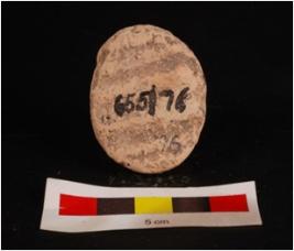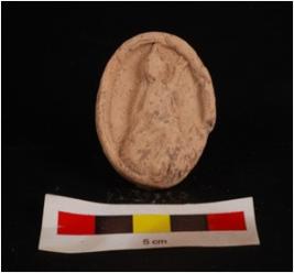 | Description / विवरण | Mould made, sun baked clay plaque with seated diety, surface s circular and cruded, edges are slightly chipped off, mat impression on back side, deity features are not clear. |