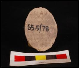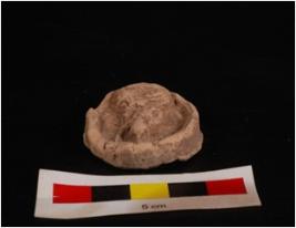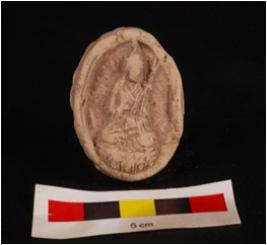 | Description / विवरण | Mould made, sundried clay plaque with seated human figure, right hand in abhay mundra drapery on left sholder, seated on lotus petals, circular in shape and edges are slightly broken. |