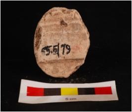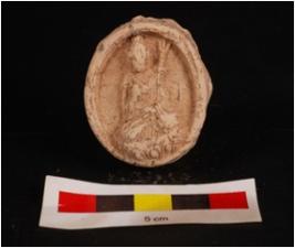 | Description / विवरण | Mould made, sun baked clay plaque with seated on lotus petals pedastals, drapery on left shulder and suggested by small incised design, circular in shape and mat impression on back side. |
