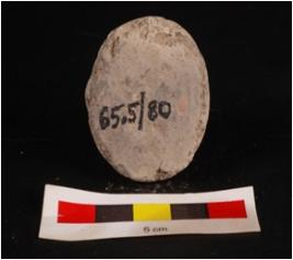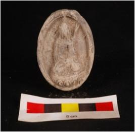 | Description / विवरण | Mould made, sun baked clay plaque with seated diety, seated on lotus petals pedastals, facial features are not clear, circular in shape and edges slightly chipped off. |