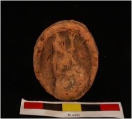 | Description / विवरण | Mould made, sun dried clay plaque with seated human figure, circular in shape and wash treatment is given, edges are slightly broken, figure seated on lotus petals, drapery on right shoulder. |