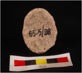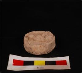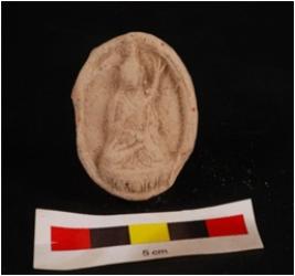 | Description / विवरण | Mould made sun dried clay plaque with seated human figure, right hand in abhay mudra drapery on left shoulder and seated on lotus petals, circular in shape and edges are slightly chipped off. |