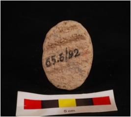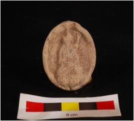 | Description / विवरण | Mould made, sun dried clay plaque with seated human figurine, right hand in abhay mudra drapery on left shoulder, seated on lotus petals, circular in shape, mat impression on back side and edges chipped off. |