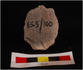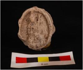 | Description / विवरण | Mould made, ill fired terracotta plaque with seated human figurine, circular in shape and edges are broken, black side surface s black. |