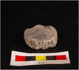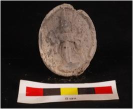 | Description / विवरण | Mould made, sun baked clay plaque with standing deity, standing on pedastal, three arms visible other features are clear, circular in shape and edges are broken black surface. |
