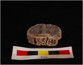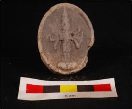 | Description / विवरण | Mould made, sun baked clay plaque with standing deity, stand on pedastal, six arms are slightly visible, circular in shape and edges are broken, surface is black. |