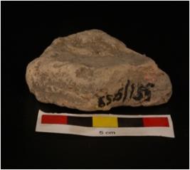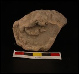 | Description / विवरण | Fragment of moulded terracotta plaque, with figure of diety. Upper portion is visible, holding flower is one arm, facial featuresare visible, decorated edges, rough surface. Grey in colour. |