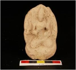| Description / विवरण | Moulded plaque with a seated deity, made with fine clay, sun baked and surface has wash in buff colour, he is seated in padmasana on a lotus pedastal, one hand is on his chest holding a disc. |