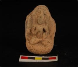 | Description / विवरण | Moulded plaque, figure of deity is depicted is seated posture on aasana, features are not clear, arms and legs are visible with drapery. |