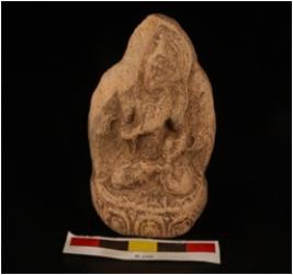 | Description / विवरण | Moulded terracotta on plaque with deity in seated posture, slightly chipped off from surface, surface is decorated with spiral and loop embossed design, right hand on breast and left hand rested on thigh. |