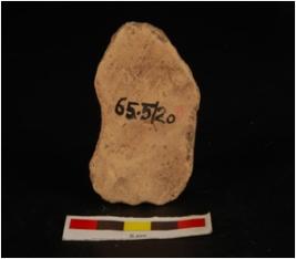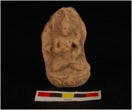 | Description / विवरण | Moulded plaque, deity on obverse side in seated posture on aasana, aasana is decorated with lotus petals edge is broken from one side. Decorated surface features are not visible, arms and legs are visible. |