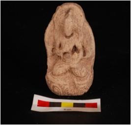 | Description / विवरण | Moulded plaque depicting seated buddha is padmasana posture on a lotus throne, designed by incised lines, head tilted towards left, facial feature is not clear, right hand kept on chest, left hand kept on thigh & holding lotus linear creeper surrounding the body and traces of dull red wash. |