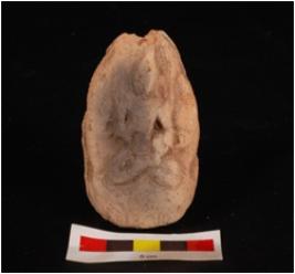 | Description / विवरण | Moulded plaque depicting seated buddha in padmasana posture on a lotus throne, designed by incised lines, head tilted towards left, face & jata not clear, right hand kept on chest, left on thigh and creeper visible on left. |