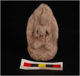 | Description / विवरण | Moulded plaque depicting, seated budda in padmasana posture, keeping the right foot on left thigh, face is not clear, jata tied on top long ears are visible, right hand is kept on chest, palms not visible, left hand kept on thigh holding lotus and creeper surrouned the body. |