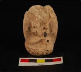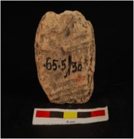 | Description / विवरण | Moulded clay plaque with figure of deity in seated posture. Partly broken, upper portion is damaged, figure is seated on aasana which is decorated with lotus petals surface is decorated with spiral design and drapery is visible. |