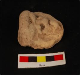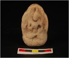 | Description / विवरण | Moulded plaque image of seated buddha, features are less visible crown on head, flowing garments, padmasana on a lotus throne, right hand near the chest, left hand holding unidentified object resting on lap, ornaments on neck and waist. |