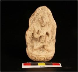 | Description / विवरण | Moulded plaque with a seated deity, deity on a lotus pedestal seated in padmasana, holding a disc in front of the chest. Draperies are minutely done with incised. |