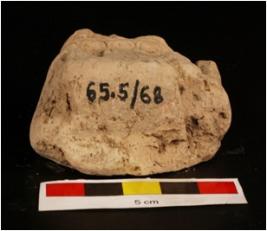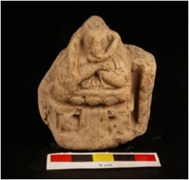 | Description / विवरण | Moulded plaque fragment, with a seated deity, the head of the deity, is missing, he is in dhyanimudra seated in padmasana surface has wash in dull red. |