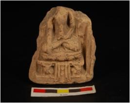 | Description / विवरण | Plaque with headless buddha image sitting on louts throne in bhumisparsha posture folded legs and right hand touching the throne . Left hand holds an object, traces of ornaments on the chest visible. The base of the lotus have a platfrom with two elephants support and a rectangular pillar on the plaque, back ground of image is decorated with creepers. |