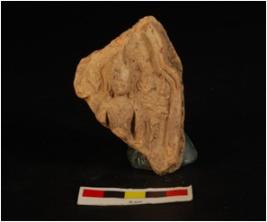 | Description / विवरण | Mould made plaque depicting buddha, only bust part visible, ears lobes visible with earrings, ornamented crown, ornaments on chest, two broken hands, Creepers are seen in the back ground features of face not clear a bell motif on left side. |