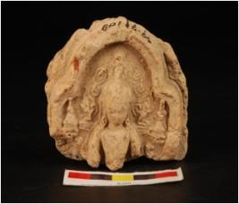 | Description / विवरण | Partly broken mould made plaque with image of buddha, flames of creepers and two bells on both the sides in back ground, facial features not visible, ear lobes long with ear ornament and wearing crown. |