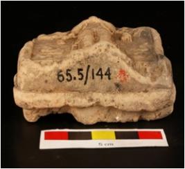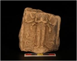 | Description / विवरण | Moulded figurine of deity avalokiteshwara , head is broken, all 8 hands are visible, deity is standing on lotus but lotus is not visible because it is eroded, Deity is wearing heavy drapery and ornaments. It is inscribed, in middle stupa along with vedika and dome is present and floral motif is chipped off. |