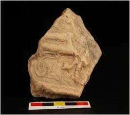 | Description / विवरण | Moulded plaque the figure of the deity in missing and draperies done with minute incises. |