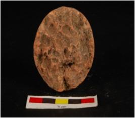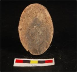| Description / विवरण | Terracotta plaque, round in shape, flat base with incised human figure on reverse side, uneven and rough on obverse side. Groove is visible and black stain on reverse side. |