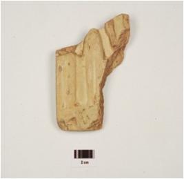 | Description / विवरण | Fragment of moulded terracotta male figurine on plaque depicting from waist to leg, slender legs standing on base, wearing translucent drapery and head is broken, |
