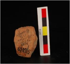 | Description / विवरण | Terracotta fragment of female figurine of female breast, headless, arms are missing, embossed waist band is visible, plaqued and buff in colour. |