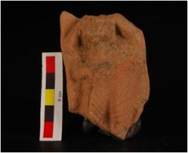 | Description / विवरण | Terracotta plaque depicting torso of deity in dancing posture, both hands are resting on waist, arms are partly broken, surface is chipped off ornamented with necklace and waistband Drapery is indicated by embossed slant lines. |